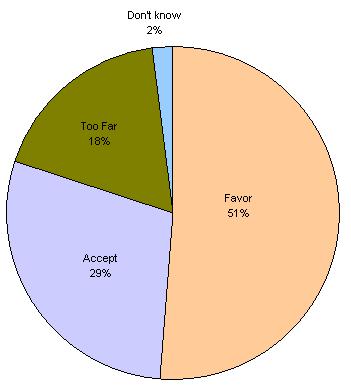 Public opinion was equivocal on whether civil liberties were in jeopardy immediately after September 11 (Click to see chart) The nation remained divided on this issue one year later. In general, support for relaxing standards was highest immediately after the attacks. Although a majority believed that the government would act responsibly , a majority also indicated concern that investigatory powers might be misused. For example a majority believed that the government would use such powers to investigate legitimate groups and that there would be broad profiling of people and searching them based on their nationality, race or religion. Today a majority still supports the concept of a national ID system and camera surveillance but there is very limited support for more intrusive tactics, such as widespread electronic surveillance.