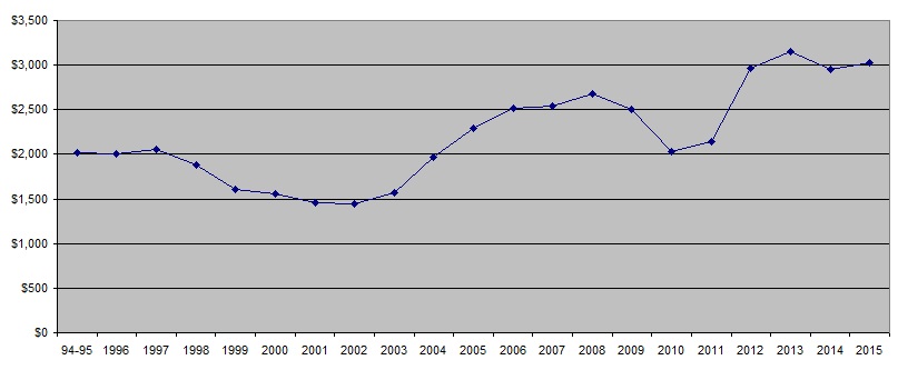 Annual Net Cost of Public University After Financial Aid and Tax Breaks 1994-2015 in 2014 Dollars