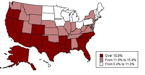 Most would agree that the primary problem with the U.S. health care financing system is that it leaves a large group of Americans uninsured. Many of the very poor are covered by Medicaid but others are not. A large group of uninsured Americans are lower income workers who work for employers who do not offer medical insurance. As more jobs move from the manufacturing sector to the service sector, this group is increasing in number. This is particularly true in states like California where the service sector of the economy has grown most. (Click to see map)