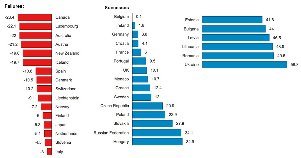 Overall the richer countries in Europe and North America are emitting greenhouse gases at a rate disproportionate to their populations. The United States and Canada are the largest consumers of oil per capita. When carbon dioxide emissions are compared to the size of the economy, the U.S. and Canada fall into the medium range but Europe's performance is much better.
