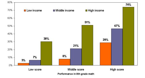 Many believe that economic inequality is a disturbing trend because of the increasing polarization of what had been an admirably pluralistic society. Income disparities have produced conspicuous consumption among the wealthy and an impoverished "underclass" which includes most recent immigrants and a disproportionate number of African-Americans. There has been a growing "residential segregation" based on income status. America's cities and suburbs are increasingly identifiable by the income group which lives there. The consequences of this economic segregation are significantly reduced educational and vocational opportunities for those in lower income groups. For example, even those low income children who show considerable academic promise tend not to complete college.