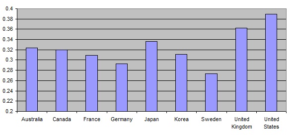 How does economic inequality in the United States compare to other countries? Among countries with modern economies, the United States is the clear leader in income inequality under the gini measure. But recently the overall trend in almost all OECD countries is toward greater income inequality. Income inequality in the U.S. is more comparable to the third world. (Click to see map) The percentage of wealth held by the top 10% is significantly higher in the U.S. than in most other developed countries. Interestingly, income inequality does not completely correspond with the density of union membership. The percentage of union workers in other countries varies significantly from country to country yet in countries like France, where there is low union membership, there is a relatively low level of income inequality. Like the U.S., most other industrialized countries have reduced their previously high marginal tax rates in the past three decades. Still, a common characteristic of countries where there is a low level of income inequality is a comparatively high marginal personal income tax rate for wealthy households.