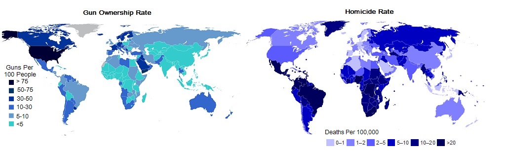 ownership of certain types of weapons although some have no restrictions. The United States is the world leader in gun ownership and it has a correspondingly high homicide rate. But there is not a clear relationship between gun ownership and the homicide rate. Countries such as Canada have a significant degree of gun ownership yet a low rate of homicide.